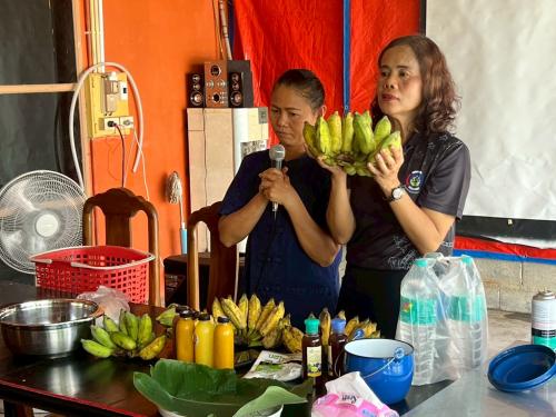 ภาคบ่าย นางสาวอมรรัตน์ ธรรมรัตน์ ปราชญ์ชุมชน บรรยายในหัวข้อ ความรู้ด้านอาชีพ และสาธิตอาชีพการทำกล้วยเพื่อสุขภาพ และนางสาวฝาริดา บัวนาค ปราชญ์ชุมชน บรรยายในหัวข้อ ความรู้ด้านอาชีพ การทำการตลาดออนไลน์ และสาธิตอาชีพการทำไก่นมสด และประเมินผลการฝึกอบรม